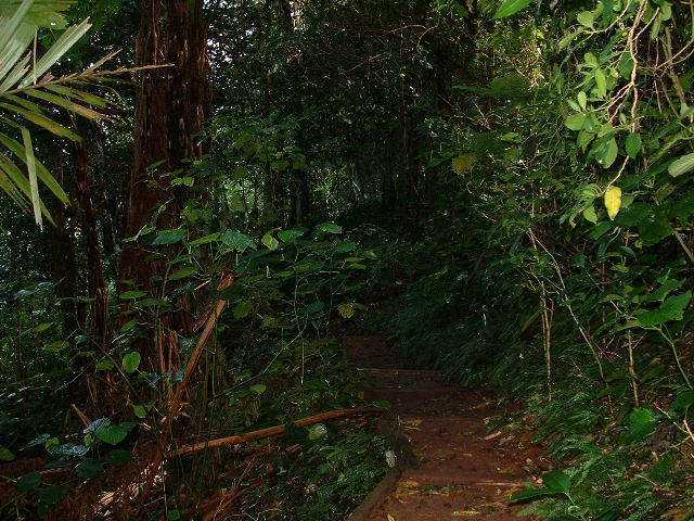 You trudge on along the path through the forest. It gradually narrows. It looks like not many people have been this way recently. The trees and bushes feel like they're pressing in on you. You notice something twinkling on the ground nearby. But you also hear something large crashing through the undergrowth towards you.