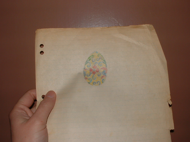 You cautiously grab it and unfold it. It's a drawing of the magic egg! The paper looks old and the colours have faded somewhat. A previous explorer must have dropped it. It shows that you're on the right path. Someone must have seen the egg, to be able to draw such a detailed picture.